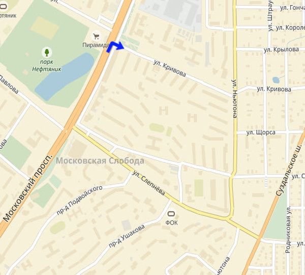 Рассмотрим правый поворот на регулируемом перекрёстке с Московского проспекта на улицу Кривова. Движемся в правой полосе. Знаки движение по полосам, прямо и направо. Включаем правый указатель поворота. Нам горит зелёный сигнал светофора, движемся без остановки. При повороте находится пешеходный переход, отмечен белыми стрелками, им тоже горит зелёный свет, пропускаем. Наша траектория по правому положению, зелёные стрелки, расстояние до края проезжей части не более метра. Выключаем указатель поворота. Дорога справа, является второстепенной, красная стрелка, едем первыми. Пешеходов переходящих проезжую часть, как отмечено белыми стрелками, тоже лучше пропустить. Но если следовать буквально правил, то с регулируемого перекрёстка мы уехали, это нерегулируемый перекрёсток номер два и мы на нём движемся в прямом направлении. Пешеходного перехода нет, приоритет за нами. Наша траектория зелёным. Справа, красным, выезд с прилегающей территории, не пропускаем. Набираем скорость.